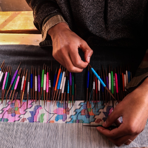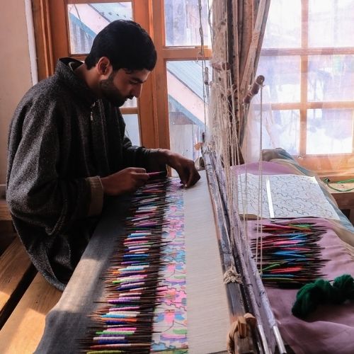Kani-Schals sind Feinstarbeit, werden doch bei dieser traditionellen Web-Schlingtechnik feinste Wollgarne (Pashminas) verwendet, die zumeist auf der Rückseite zu „ziselierten“ Mustern verwebt und verschlungen werden. Das mehrfarbige Muster wird eingewebt, wobei das Schussgarn bei jedem Richtungswechsel mit dem Garn des Hintergrunds verkreuzt wird. Die Kani-Technik kommt aus Kaschmir und wird noch heute in Nordindien im Kaschmir-Gebiet ganz besonders gepflegt. In jedem Kani-Schal steckt die Handwerkskunst einer langen Fertigungs-Tradition aus den Tälern Kaschmirs.